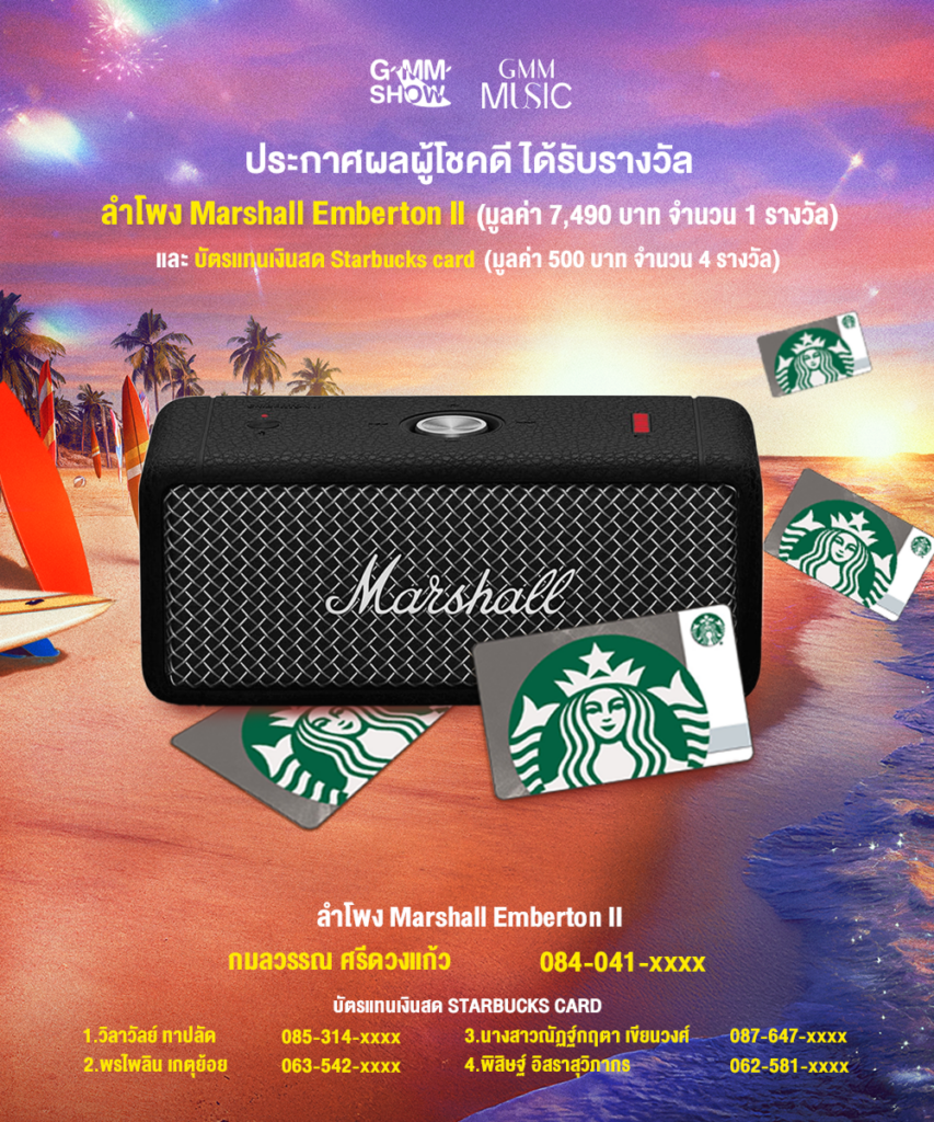 - 2. ของรางวัลทั้งหมดได้แก่ ลำโพง Marshall Emberton II มูลค่า 7,490 บาท จำนวน 1 รางวัล และบัตรแทนเงินสด Starbucks card มูลค่า 500 บาท จำนวน 4 รางวัล