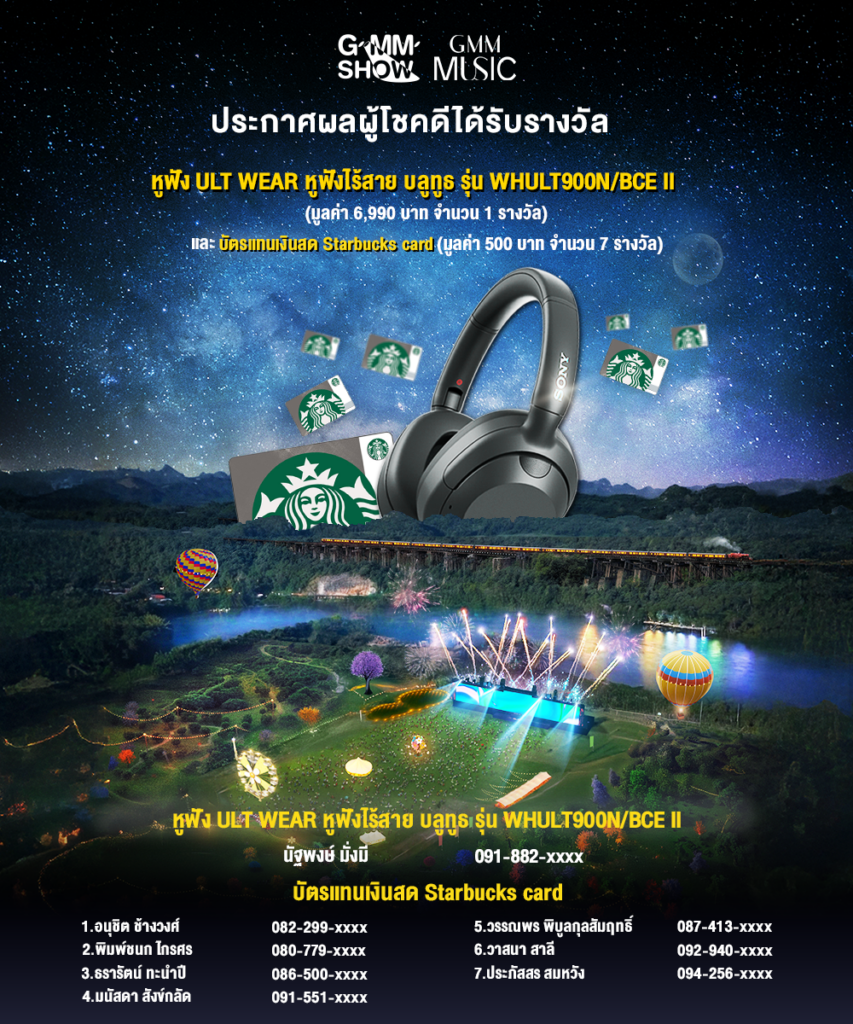 - 2. ของรางวัลทั้งหมดได้แก่ ULT WEAR หูฟังไร้สาย บลูทูธ รุ่น WHULT900N มูลค่า 6,990 บาท จำนวน 1 รางวัล และบัตรแทนเงินสด Starbucks card มูลค่า 500 บาท จำนวน 7 รางวัล